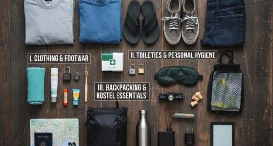 On long trips, you need essential items like travel gadgets—power banks, universal adapters, and headphones—to stay connected and entertained. Don’t forget a language translation device or app to communicate easily in foreign countries. Pack versatile clothing, toiletries, and important documents. Prioritize lightweight, multi-purpose items to save space. These essentials make certain of comfort, convenience, and smooth travel experiences, helping you stay prepared and enjoy your journey without unnecessary stress.