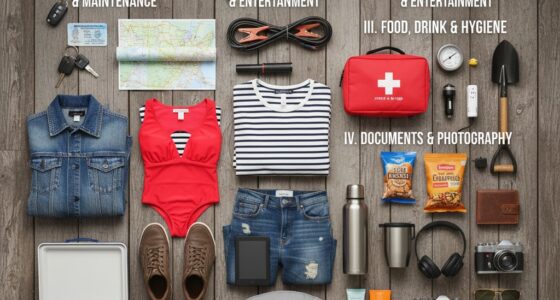 Are you prepared to make your journey more comfortable? Packing travel comforts and accessories can greatly improve your trip. A travel pillow supports your neck and helps prevent stiffness during long flights or drives, ensuring you arrive refreshed. Eye masks block out light, making it easier to rest even in bright or unfamiliar environments. Both items are lightweight and easy to pack in your carry-on. Consider choosing a compact, adjustable travel pillow for versatility and comfort. An eye mask with a soft, breathable fabric adds a touch of luxury and helps you fall asleep faster. Including these essentials guarantees you can rest better on the go, reducing fatigue and making your trip more enjoyable. Don’t forget these simple comforts—they’ll make a big difference.
